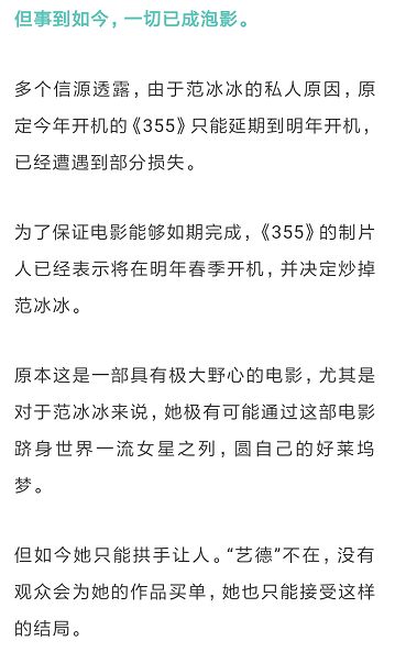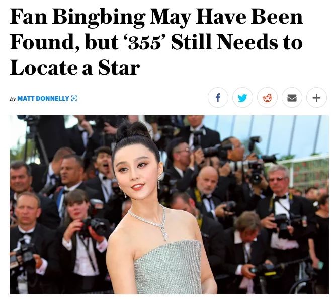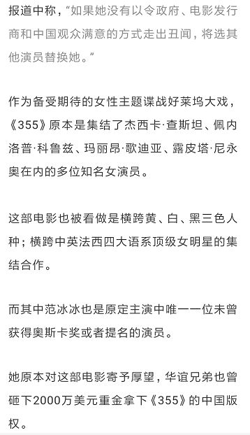 据外媒报道,原本确定范冰冰为女主角的好莱坞大片《355》,极可能因这次的丑闻事件解雇她。