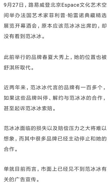 9月12日,澳大利亚保健品公司SwisseWellness宣布会暂停与范冰冰的合作。