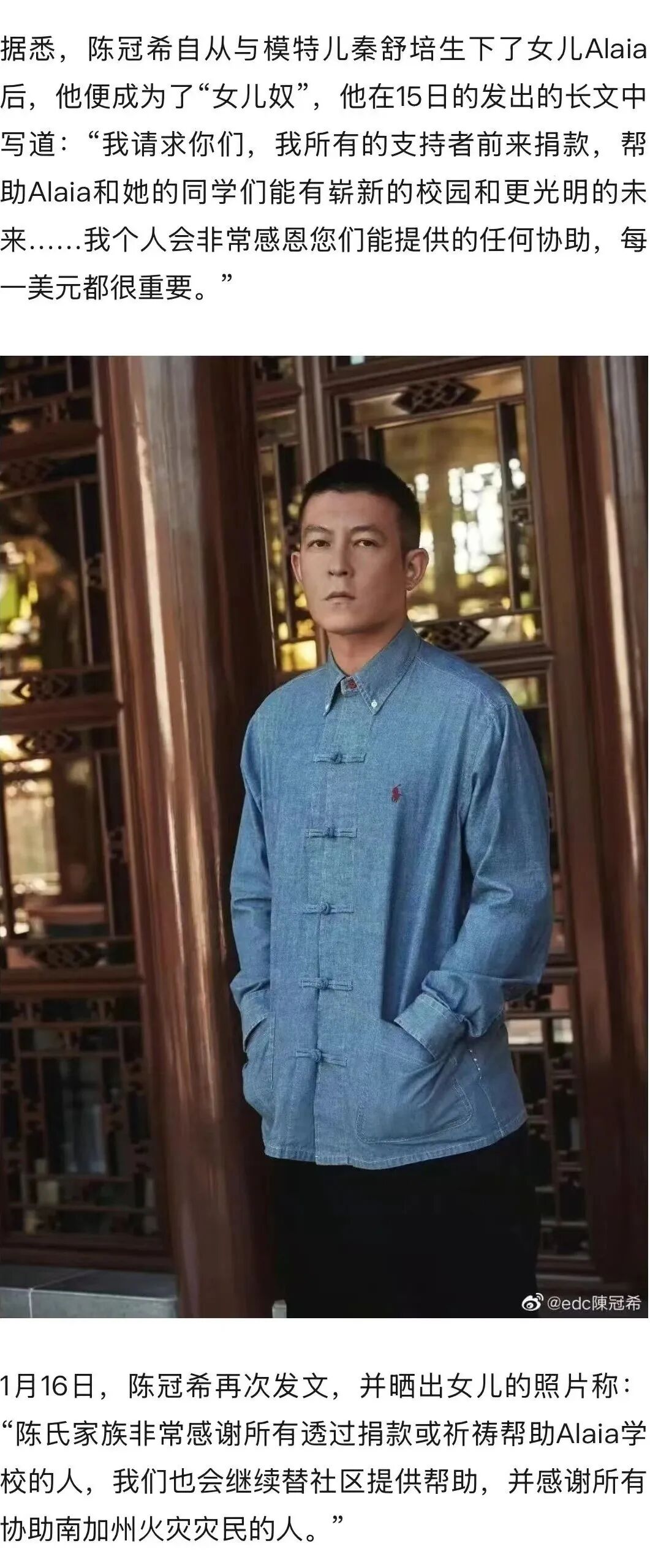 陈冠希发文:女儿学校在洛杉矶山火中被彻底摧毁,急需善款重建 海峡都市报 港台男星 2025-01-16 15:51:42 152 创作不易,用心坚持,欢迎请BaGua喝几杯爱心咖啡!打赏并支持本文 打赏并删除本文 据媒体报道,美国加利福尼亚州洛杉矶地区自7日起多场野火持续肆虐,截至13日已造成25人死亡、29人失踪。1月15日,艺人陈冠希在个人社交平台上发文表示,他女儿的学校也在这场火灾中被彻底摧毁,急需善款重建校园。来源:红星新闻编辑:大陈推荐阅读 97岁李嘉诚,突传消息!英伟达黄仁勋现身深圳:“我是来和员工过年的” 创作不易,用心坚持,欢迎请BaGua喝几杯爱心咖啡!打赏并支持本文 打赏并删除本文 感谢您的支持鼓励,我会继续努力的!文章地址:用户邮箱:打赏金额:USDT 请输入数字点击”去打赏“,即可进行打赏支持本文章哦 陈冠希 发表评论