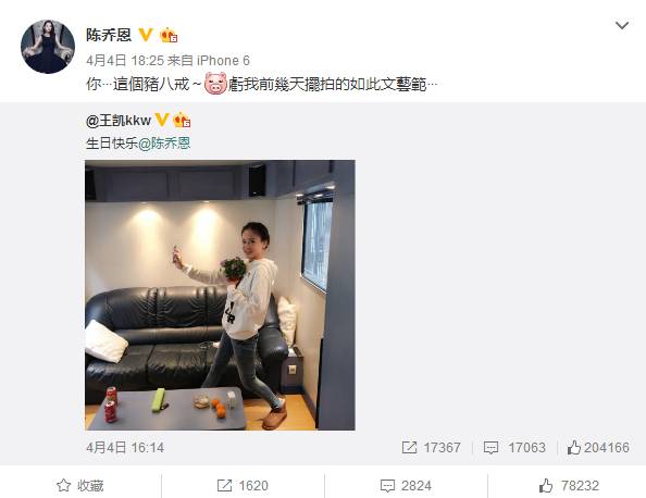还好有荧屏CP助阵,长期累积的各路资源纷纷粗线开启发糖模式,首先是共同拍戏的王凯,简单的发了一句生日快乐。放了一张不太自然的照片,被陈乔恩调侃猪八戒,可见关系非同凡响。