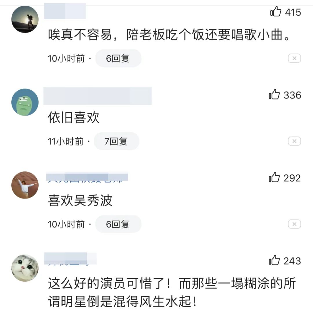 吴秀波近照曝光后,很快引起了网友的热议。甚至有网友留言“唉,真不容易,陪老板吃个饭还要唱个小曲”、“这么好的演员可惜了!而那些一塌糊涂的所谓明星倒是混得风生水起”等表达自己的看法。