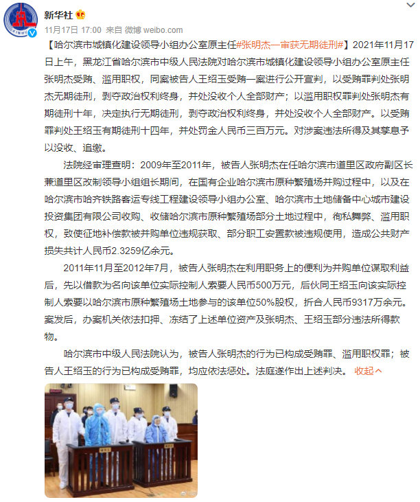 昨天下午,新华社发文张明杰因受贿、滥用职权罪一审获无期徒刑。
