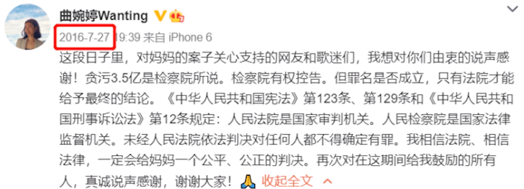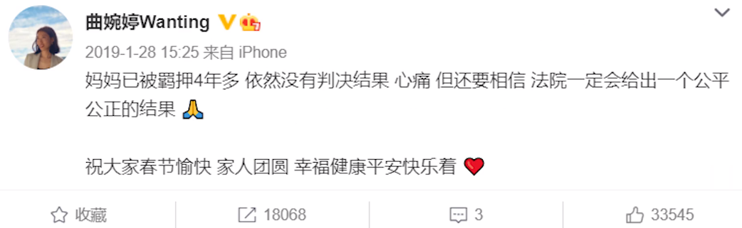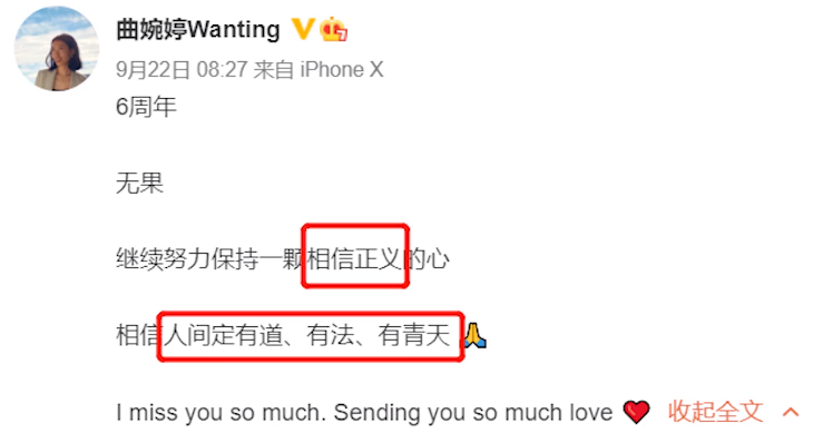 从2016年到2020年,曲婉婷每年都会在微博上“思念”母亲。