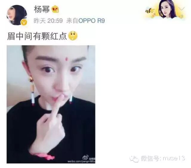 3月5日晚,杨幂在网上晒出一张自拍美照,照片中,杨幂嘟嘴卖萌大眼睛抢镜;眉间的红点显得整个人娇媚动人。
