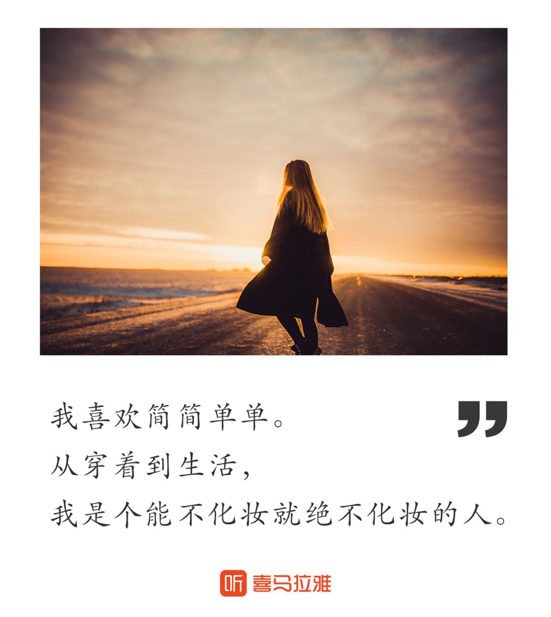 她说:“我喜欢简简单单。从穿着到生活,我是个能不化妆就绝不化妆的人。”
