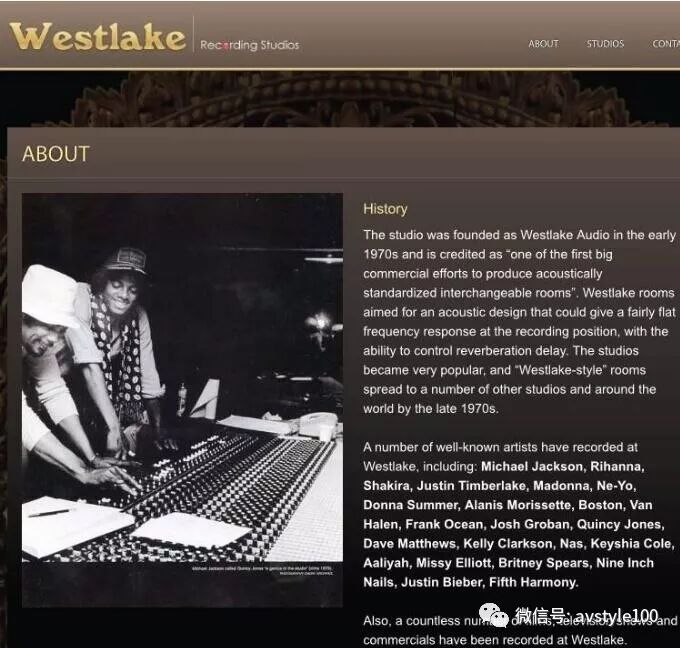 Westlake Studios录音棚成立于20世纪70年代初。该工作室被赞誉为“最初生产标准化声学互换室的巨大商业成就之一”。许多知名艺人曾经在Westlake录音,包括迈克尔杰克逊,蕾哈娜,麦当娜,贾斯汀比伯等!除此之外在此工作室录音的电影、电视节目及商业广告不胜枚举。