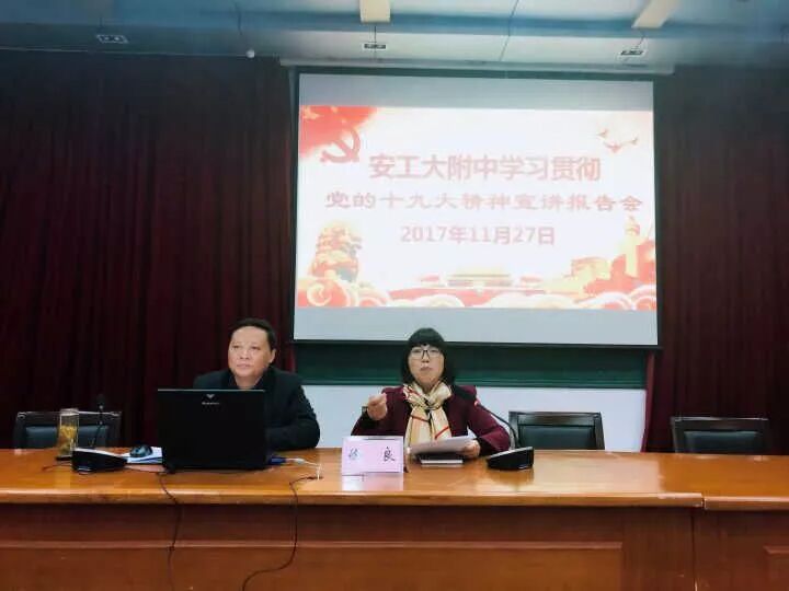 11月27日下午,马鞍山市教育局党委副书记徐良莅临安工大附中,开展党的十九大精神宣讲活动,宣讲会由安工大附中党总支书记曹淑芬主持,全体党员及教职员工参会学习。