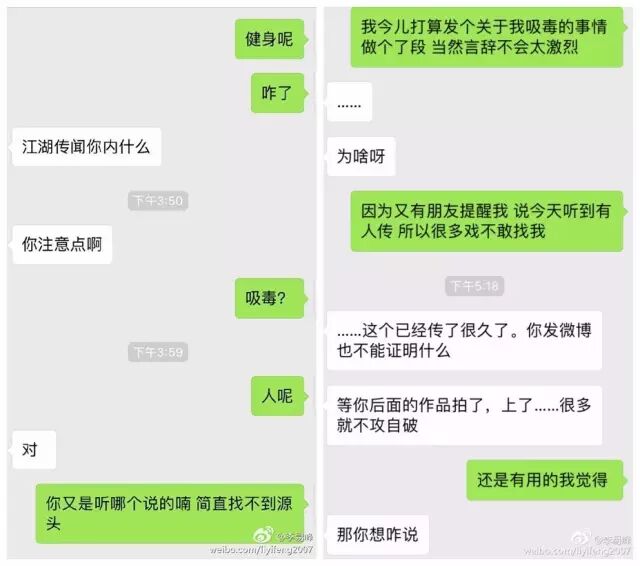 微博中,李易峰晒出与友人的聊天记录,朋友提醒他在饭桌上又听到了关于他吸毒的谣言,这令李易峰十分生气,决定发声明澄清事实,痛斥造谣传谣者。
