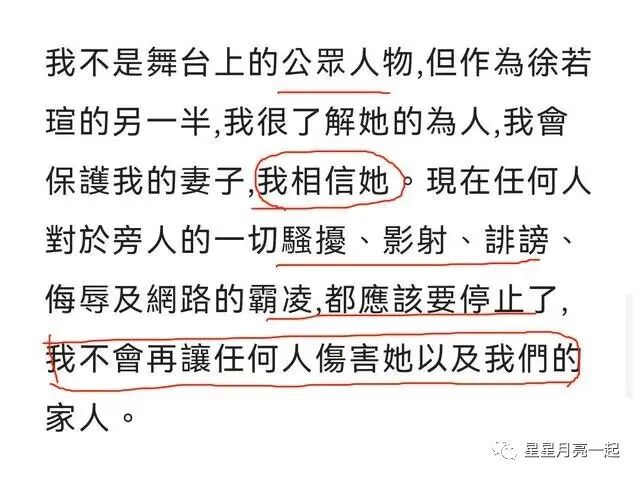第三段,主要表达了自己的态度。自己并非公众人物,作为徐若瑄的老公,对她十分信任,选择相信她。并会承担起保护家庭亲人的责任,不会让外人再来伤害她!