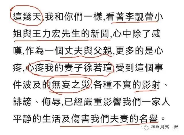 第二段,先是对李靓蕾的婚姻表示感叹,然后对妻子徐若瑄受到牵连十分心疼,并将此事件定义为“无妄之灾”。针对各种影射、侮辱、骚扰等,已经严重影响了平静的生活。