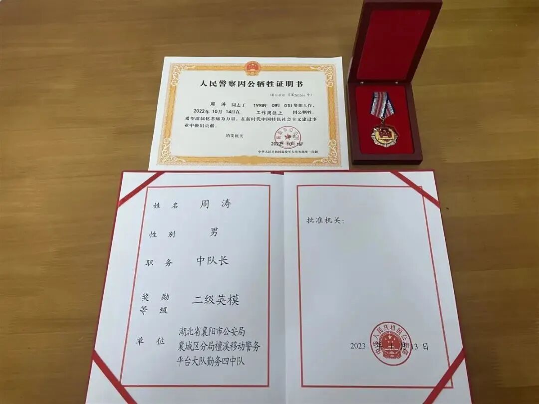 2022年9月30日,襄城区檀溪警务平台民警周涛在巡查途中因主动脉血管夹层破裂被送往医院救治。2022年10月14日,周涛经抢救无效牺牲,生命定格在46岁。