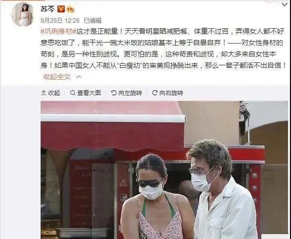 在微博上拥有5000多万粉丝的大V作家苏芩也发博,反对这种审美苛责: