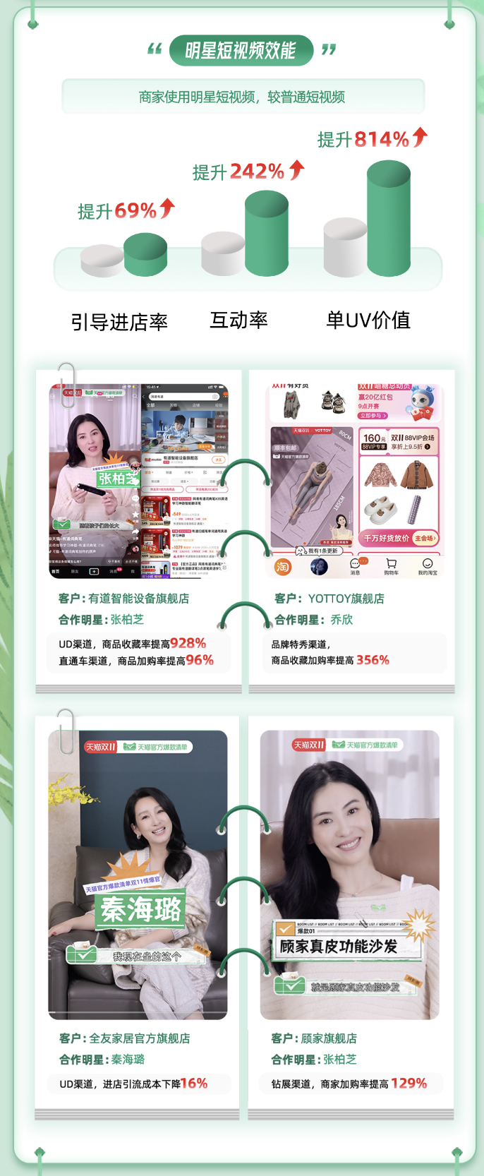 从最新披露相关数据来看,在双11期间,天猫官方爆款清单基于明星短视频品效合一创新,为重点合作品牌平均单品牌贡献客群7000万,贡献成交过亿、过千万的爆款单品继续集体爆发,成为今年双11品牌押宝增长利器之一。