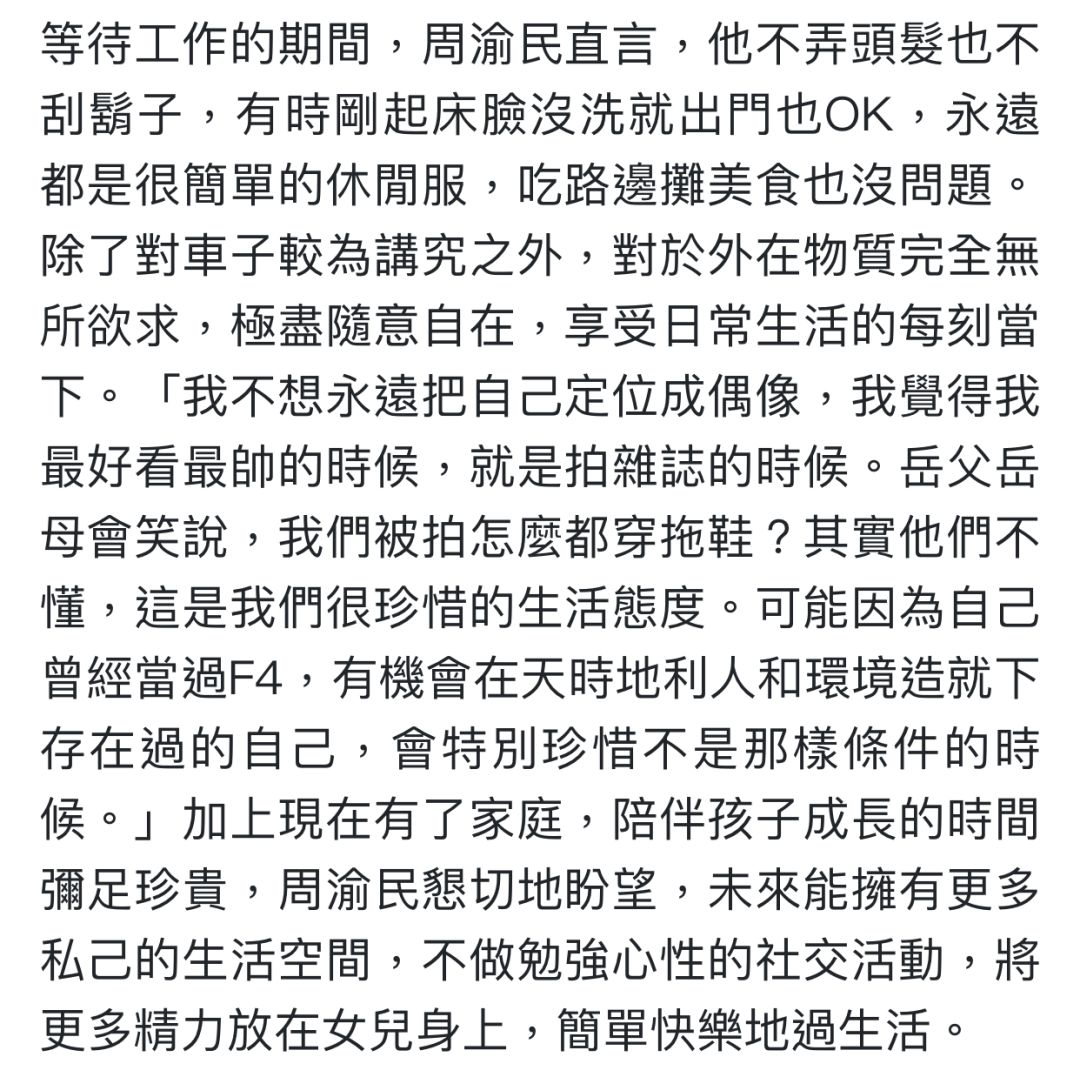 也正是因为家庭时刻牵动着他的心思,周渝民更珍惜“不是F4”的生活状态——那种踩着拖鞋吃路边摊的惬意。