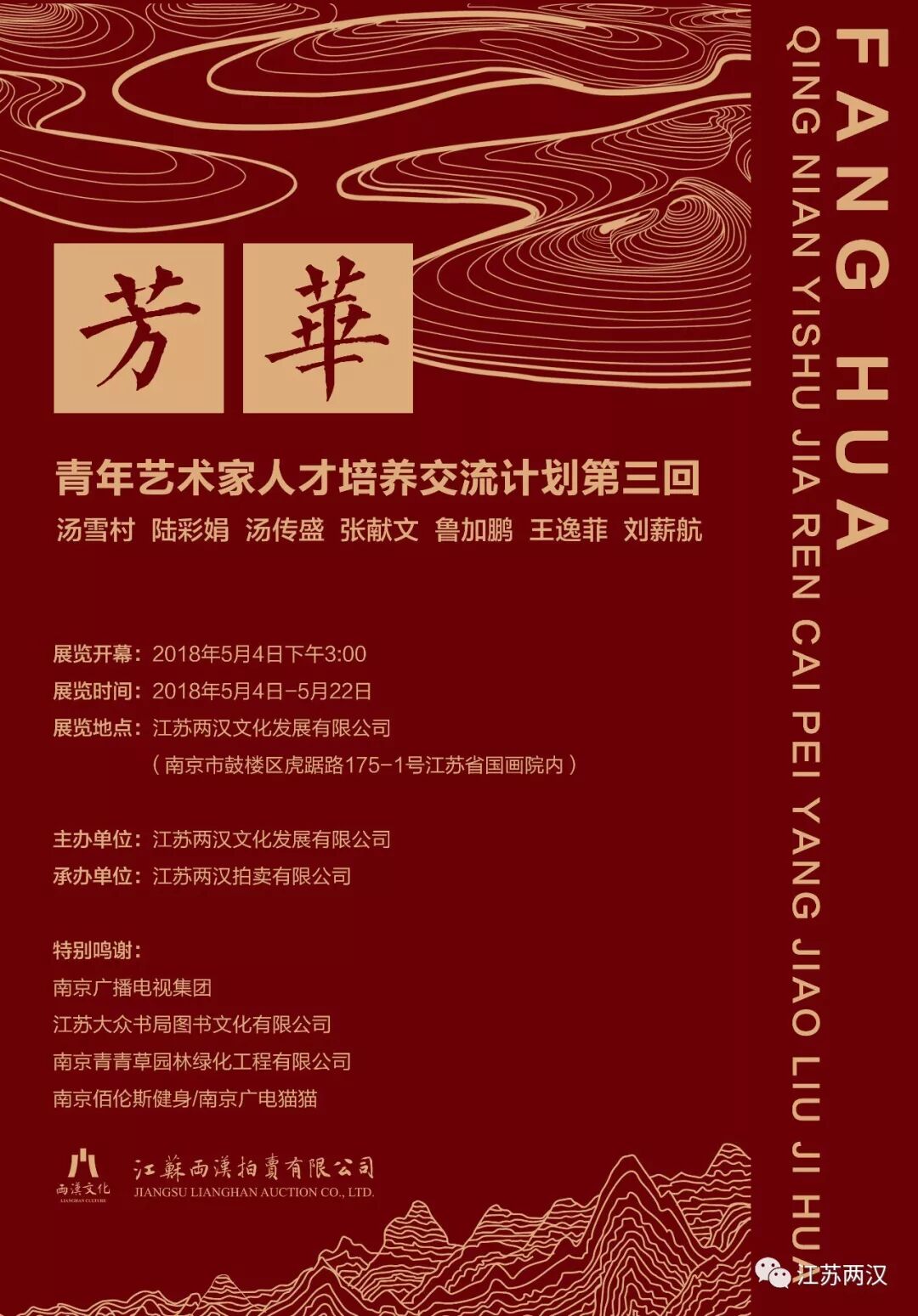 江苏两汉文化发展有限公司坐落于南京石头城上的江苏省国画院所在地、美丽的四明山庄院内,是一个致力于中国传统文化宣传、传承、发展,从事艺术品经营、鉴藏、投资、展览、策划、拍卖等文化艺术产业的公司。公司旗下江苏两汉拍卖有限公司、两汉·秦淮和两汉·彭城两大微拍平台、四明山庄画苑(画廊)和四明书院,目前与位于长江路300号的“南京品成梦想艺术空间”合作,常年举办各种艺术展览和文化活动,为艺术家和艺术品收藏爱好者提供文化艺术交流的平台。
