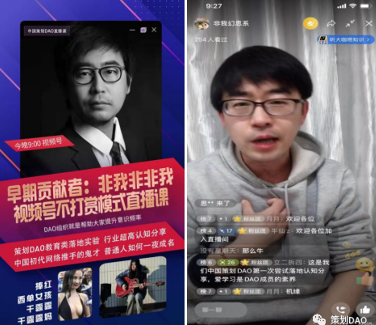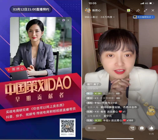 3月12日晚九点,策划DAO早期贡献者之一“陈然心”在视频号为策划DAO社区成员进行电商行业的高认知分享。陈然心曾是2009年网络第一红人,因在淘宝上出售剩余人生得到了马云的欣赏,入选年度最具创意电商。同时在淘宝上开创了一个新的门类,出售剩余时间,近3万多家店开始争相模仿。