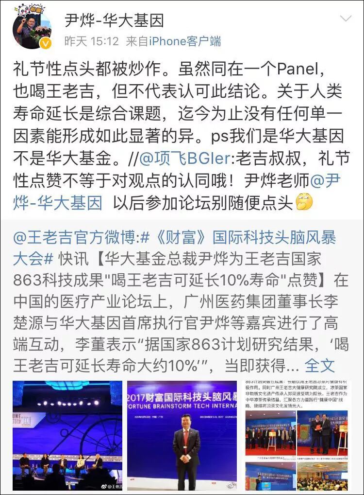 同时还表示华大基因CEO尹烨对此“点赞”,只不过广药话音刚落,尹烨就出来辟谣称自己只是“礼节性点头”,不代表认可该结论。