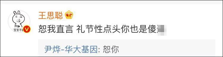 只见王思聪在尹烨的这条微博下评论:“恕我直言,礼节性点头你也是傻X”,尹烨则不痛不痒地回了一句“恕你”。