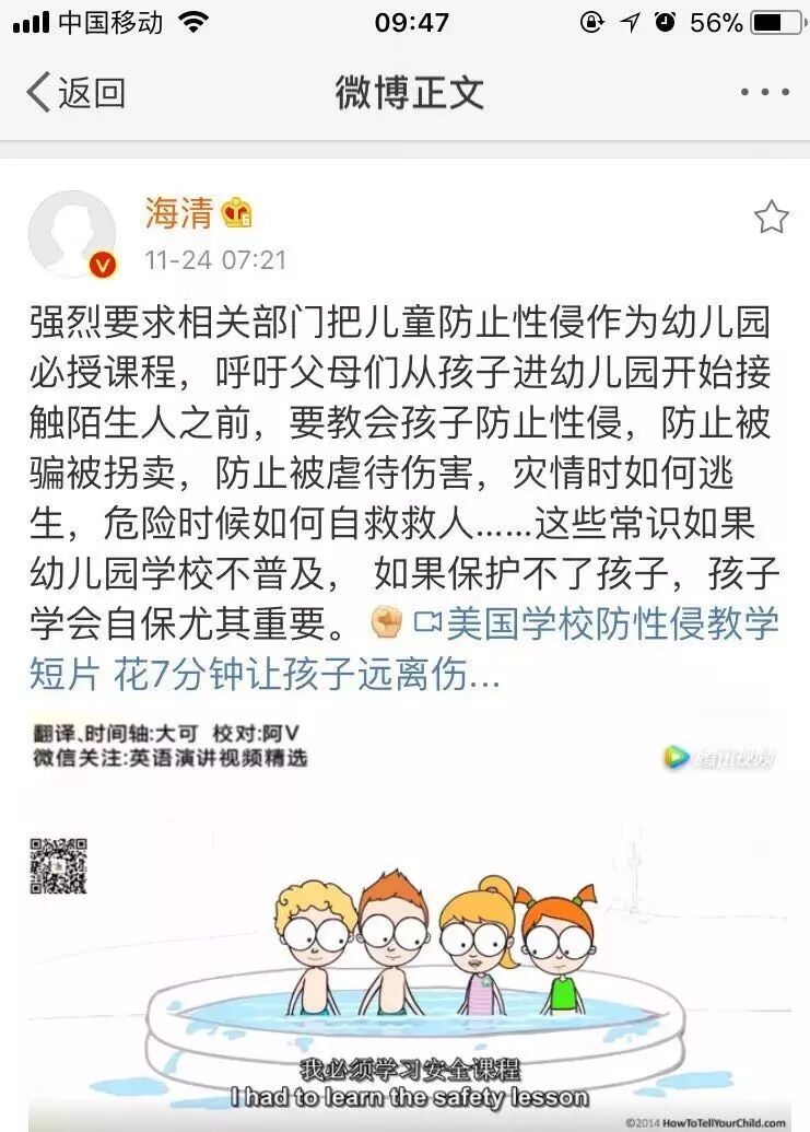 近来虐童事件引来不少舆论和愤怒,一朵品牌代言人海清也发文呼吁社会多多关注孩子的安全,正确引导孩子学会自我保护。