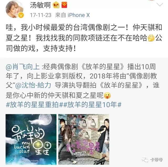 之后鞠婧祎、李艺彤、黄婷婷、林思意、许佳琪才有机会让大家认识和喜欢,其实由汤敏来饰演夏之星的消息并不是空穴来潮,有媒体拍到汤敏频繁与新版《放羊的星星》制片人见面,在自己的微博上还发了有关的微博。