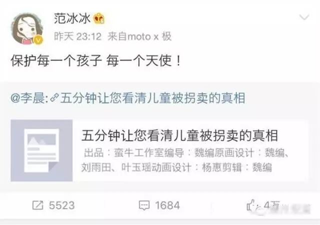 近日,范冰冰转了李晨一条微博,是关于国内拐卖儿童的视频,视频只有五分钟,看完让人有种说不出的难受...