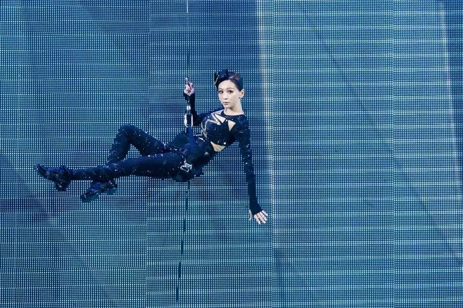 一开始就上高难度特技,吊钢索12公尺高,象征出道12年。这个姑娘也是蛮拼的!