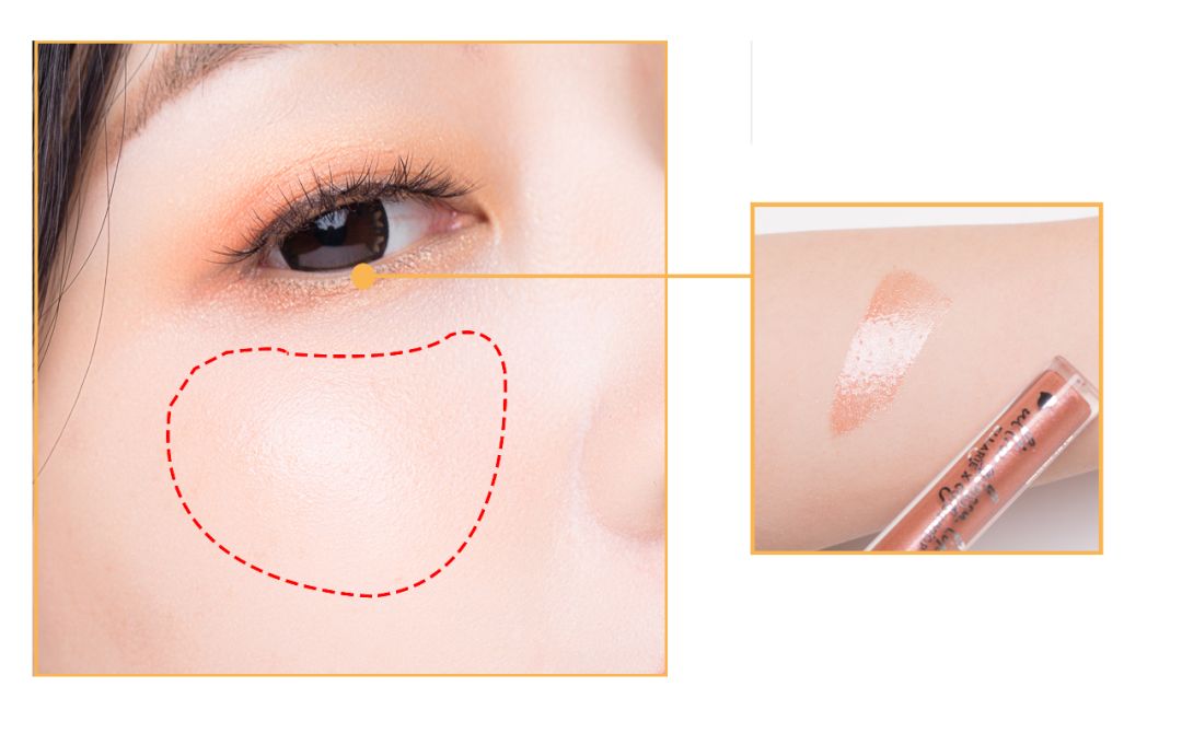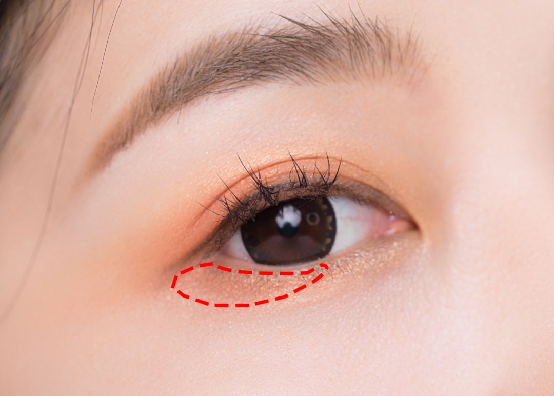 STEP4:再用珠光色的眼影,贴着下眼睑的位置画出一个前窄后宽的弧形区域。窝蚕的感觉就出来啦~