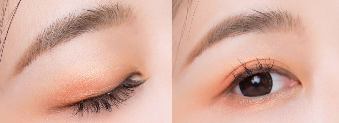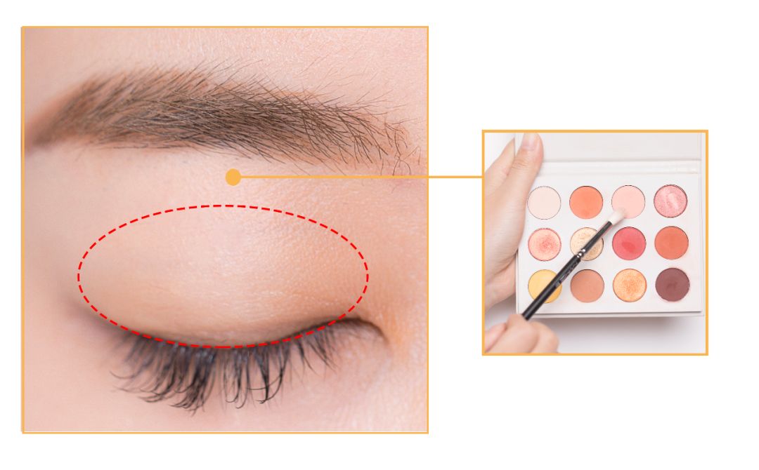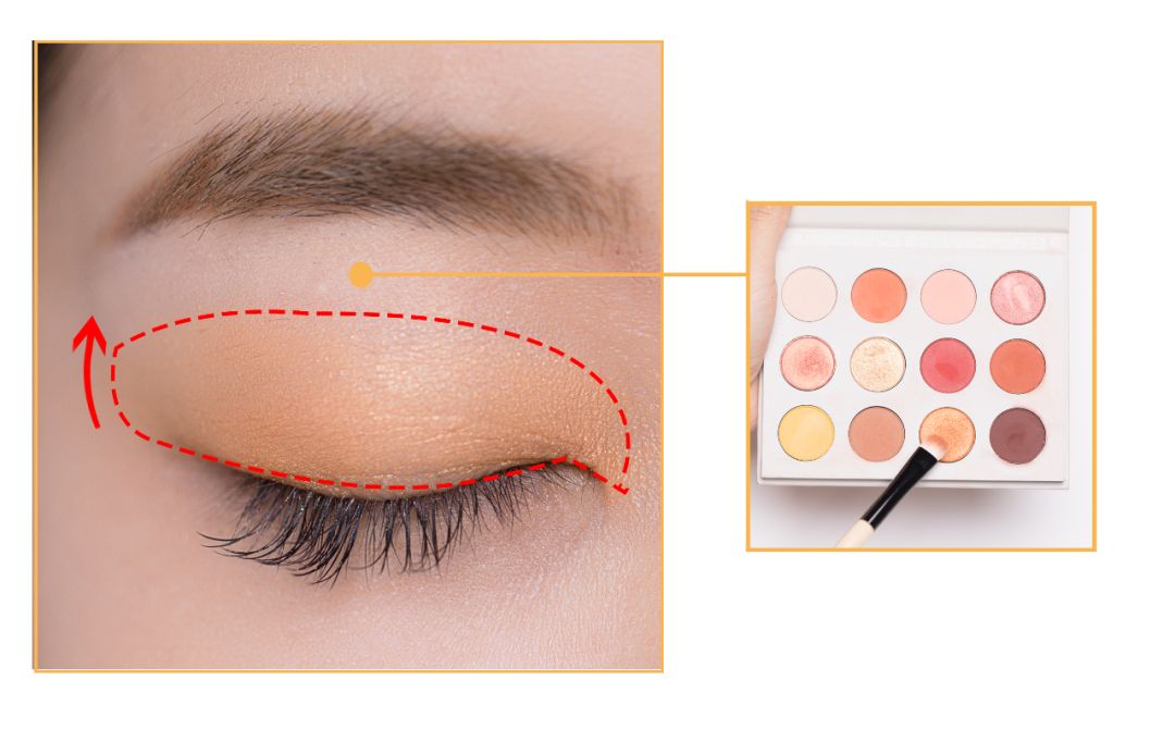 STEP2:浅橙色作为过渡色,从睫毛根处晕染向上逐渐变浅,眼头和眼尾也要轻扫几下。