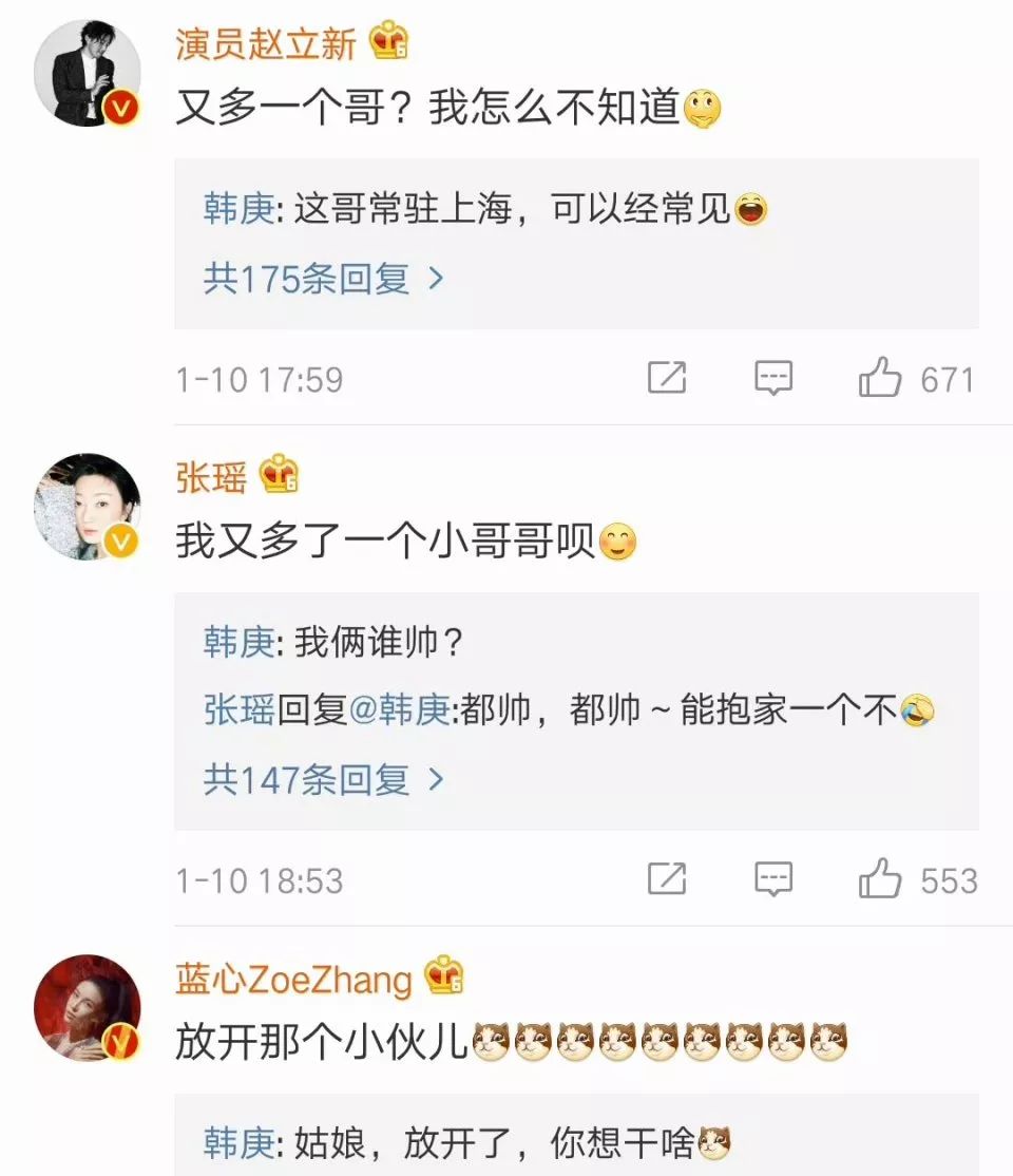 赵立新留言称:又多一个哥?我怎么不知道。韩庚幽默回应:这哥常驻上海,可以经常见!