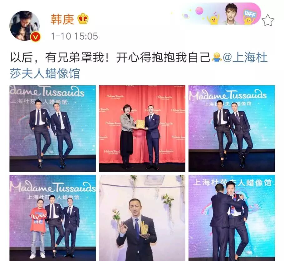 1月10日是韩庚正式入驻上海杜莎夫人蜡像馆的日子,韩庚晒出了活动上的照片,并幽默地说道:以后,有兄弟罩我!开心地抱抱我自己!