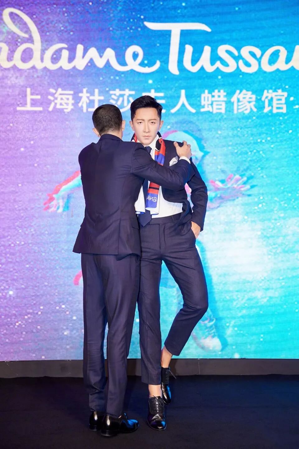 韩庚还亲手把围巾给自己的蜡像戴上,并且上前拥抱了这个大兄弟。