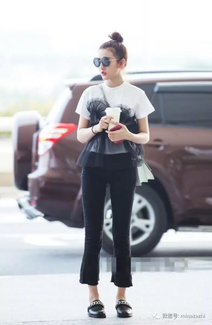 不规则纱织T恤搭配黑色七分裤,配合丸子头和墨镜,清新又可爱。