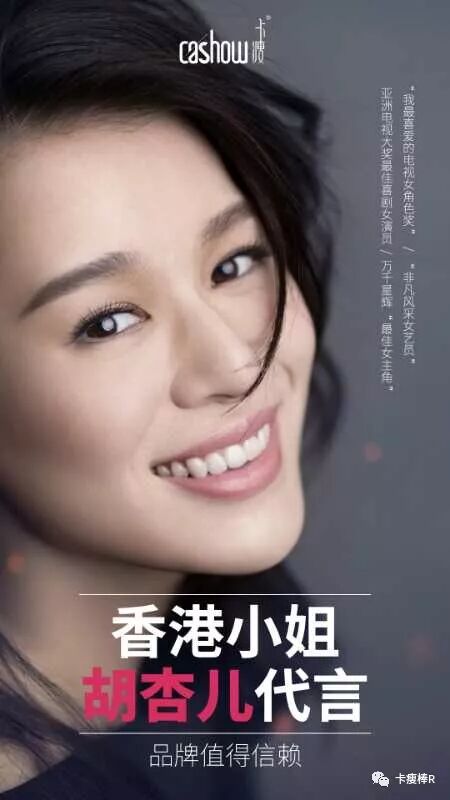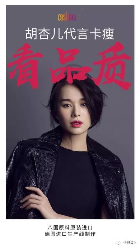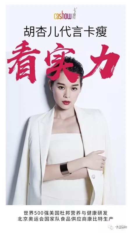 众所周知,名人代言也要了解考察。胡杏儿成为卡瘦代言人,看重的是卡瘦的实力,世界500强美国杜邦营养与健康研发,北京奥运会国家队食品供应商康比特生产;卡瘦的品质,八国原料原装进口,德国进口生产线制作;卡瘦的口碑刷屏朋友圈。胡杏儿成为卡瘦代言人。助力卡瘦更辉煌。