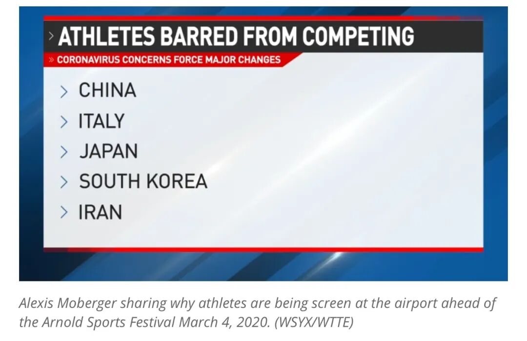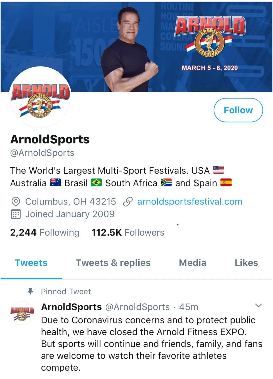 商议之后,州长做出了艰难的决定:由于新冠病毒的影响,停办与“阿诺德古典赛”配套的施瓦辛格健美博览会,“阿诺德古典赛”则照常进行,但中国、日本、韩国、意大利、伊朗等疫情严重的五个国家运动员不再参加赛事,比赛现场也仅允许参赛运动员的亲友入场,不对23万普通观众开放。