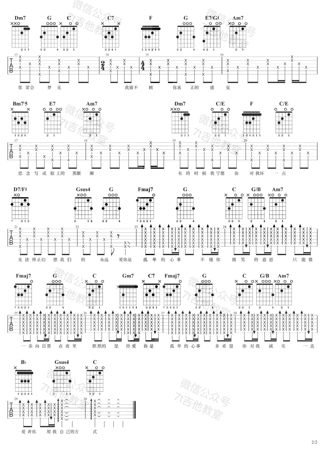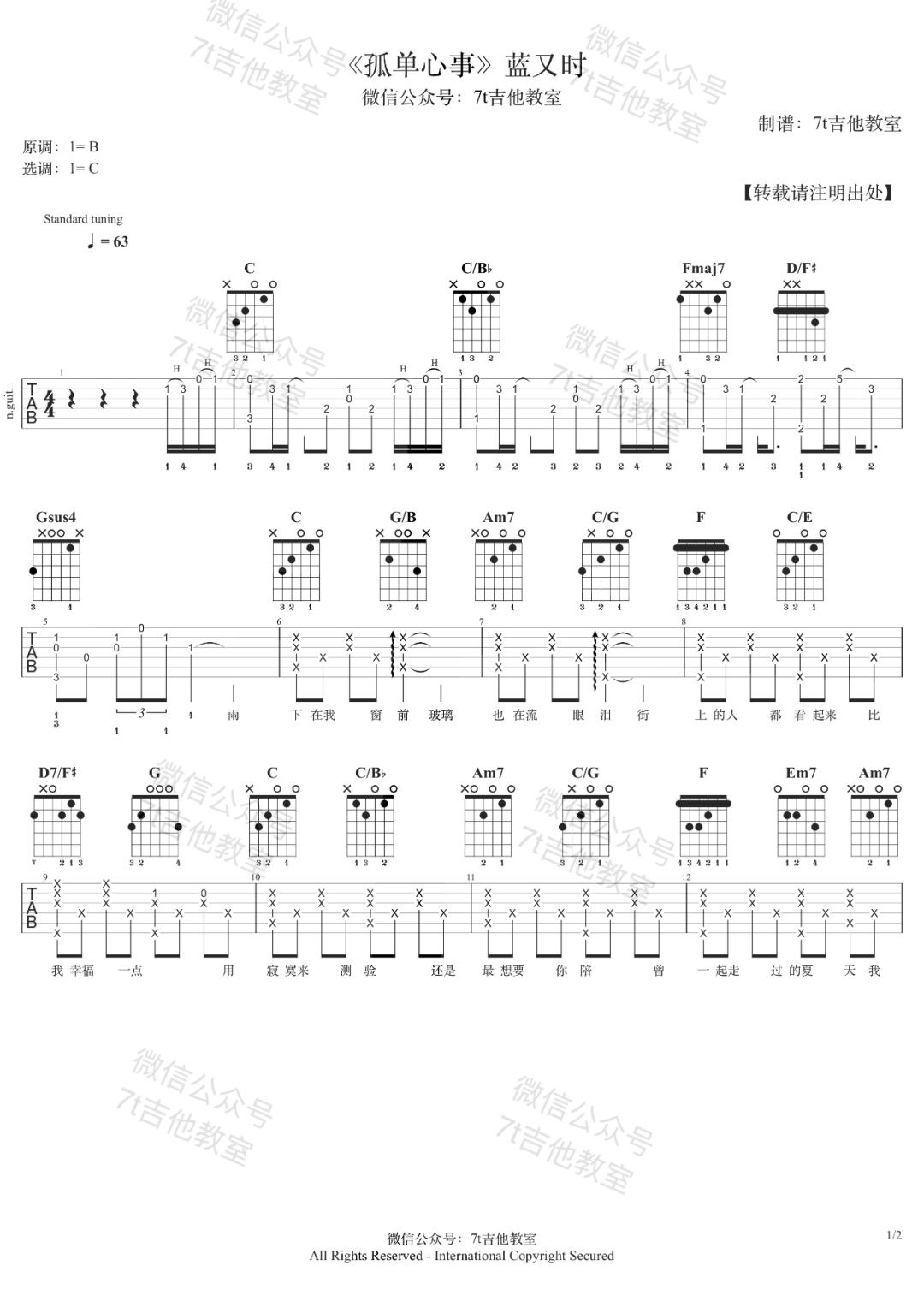上一期《孤单心事》发了这首歌的弹唱视频,本期带来视频里弹的谱子!