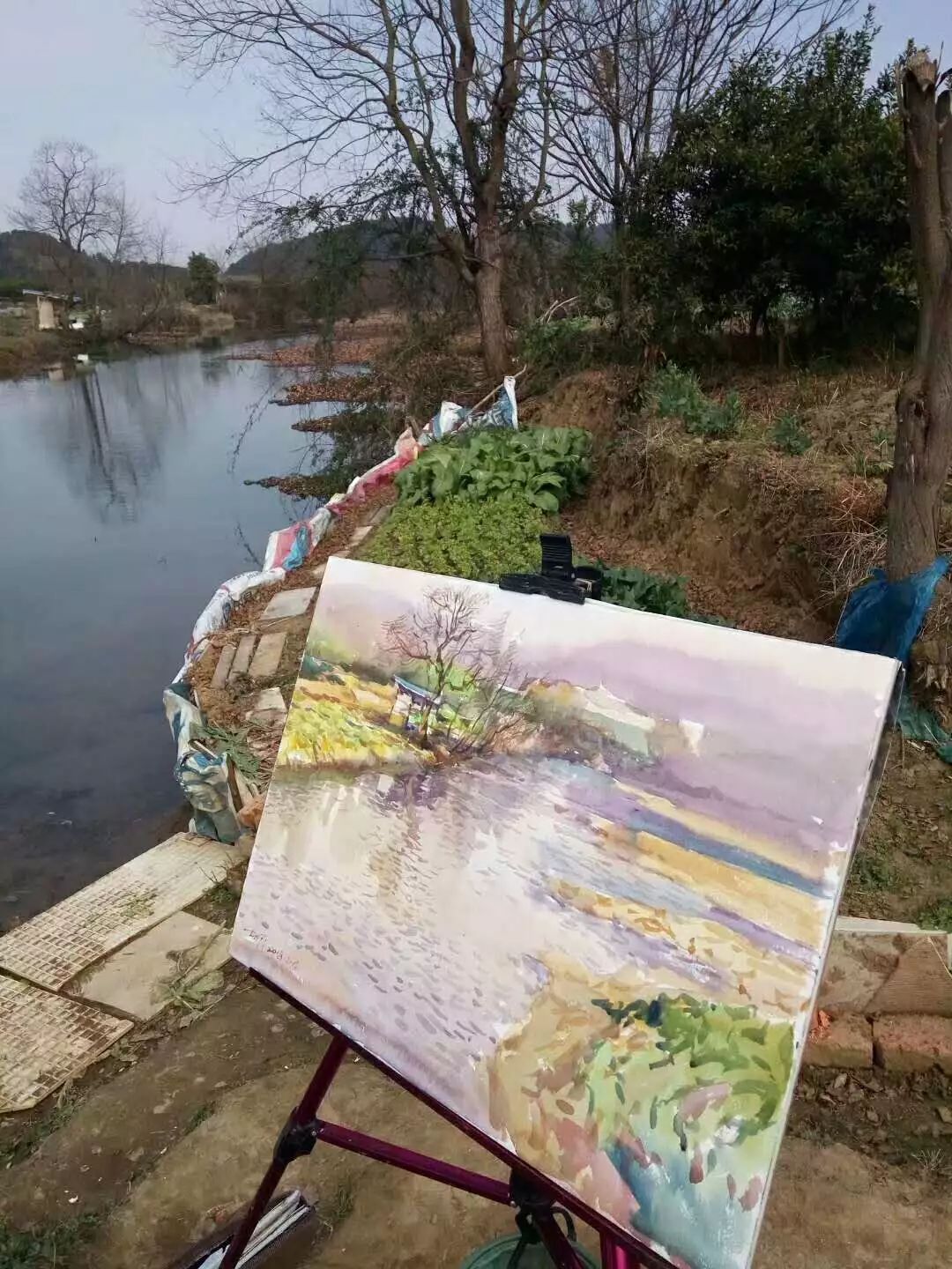 2月4日(星期日)立春时节,经湿地公园到矮岭村写生,一眼望去,远山连绵起伏,绿水蜿蜒曲折,树儿倒映水中,美哉!