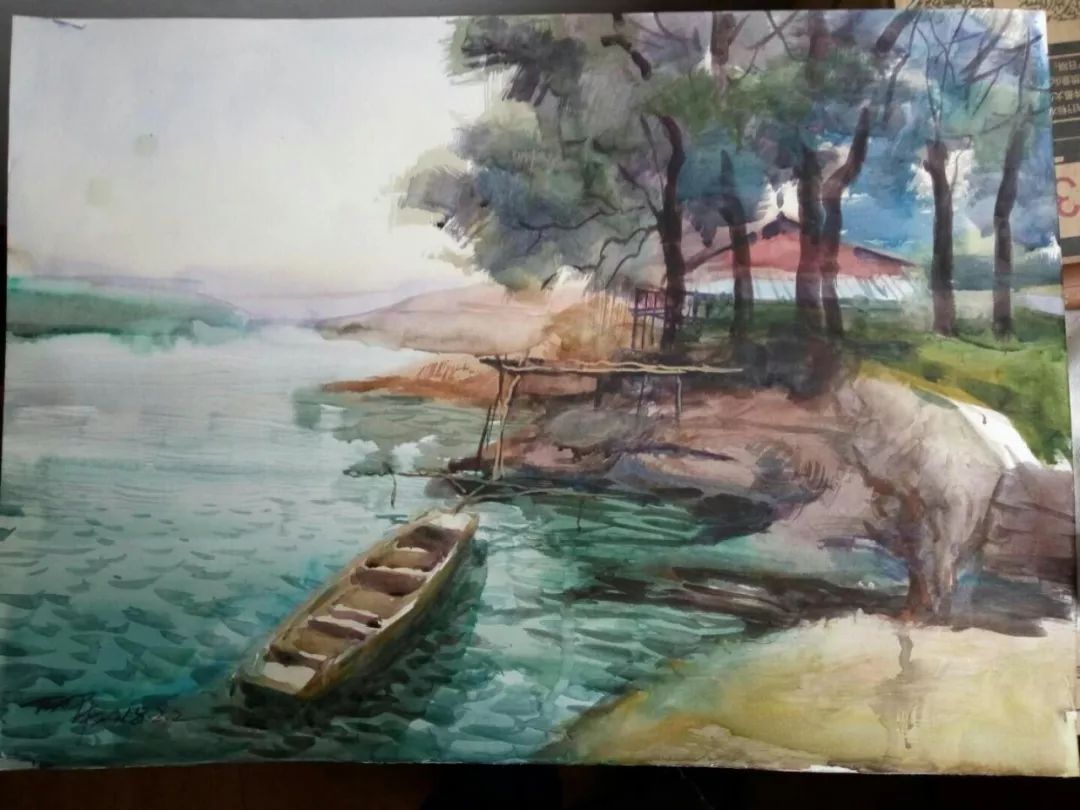 餐后下午袁河边写生,一叶小舟一江水,小小诗意。