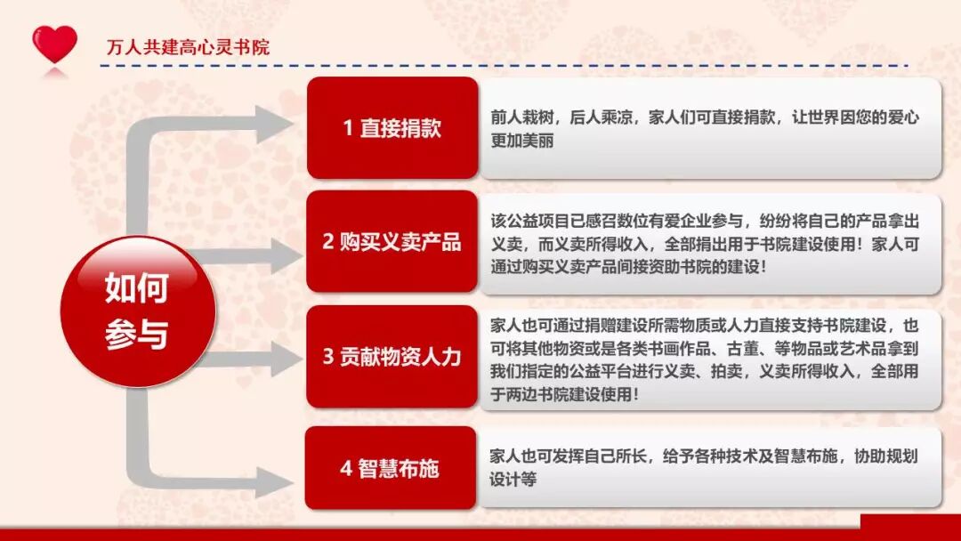 现承邀您一起加入“万人共建高心灵书院”的计划,为书院的筹建,献自己的一份爱心。
