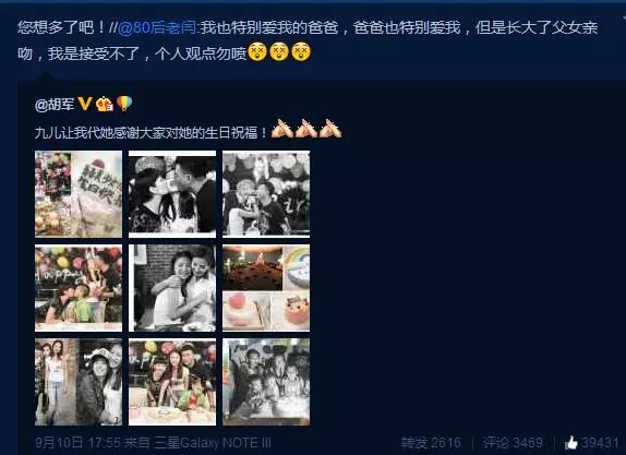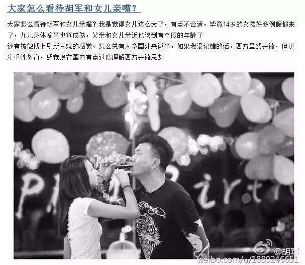 最近,胡军PO出女儿九九的庆生照,其中有一张长这样是他与14岁女儿对嘴亲吻的照片。