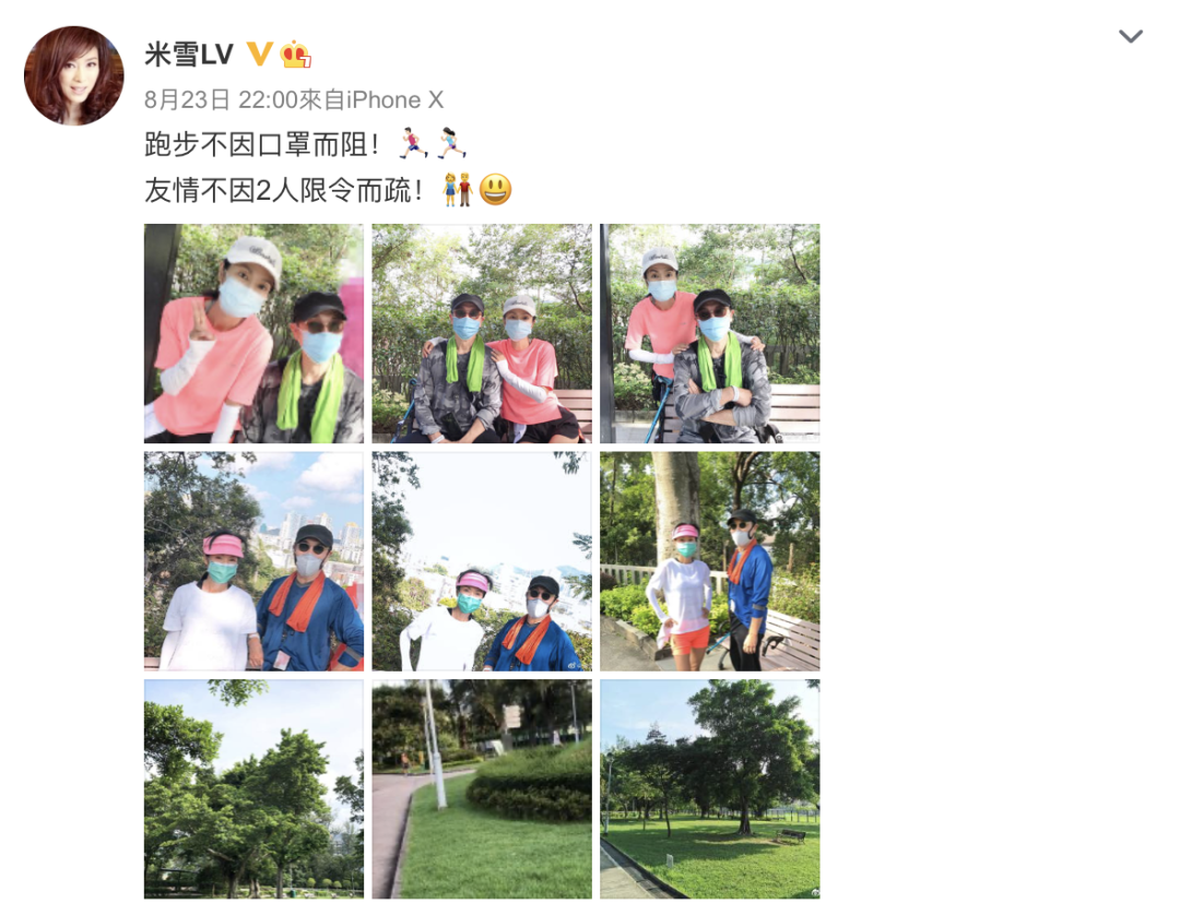 米雪晒出照片后留言表示:跑步不因口罩而阻,友情不因二人限令而疏,证明两人的友情之情。事实上在刘松仁患病后,米雪多次主动邀请他外出参加饭局或是运动。作为朋友,米雪深知患病的人难免会因为病情而影响心情,只有多多外出与朋友交谈,或者通过运动来舒缓身心,才更有利于身体的康复,可见作为老朋友的米雪非常有心意。至于刘松仁,不管他是不是中风,重点是已经慢慢恢复到从前的状态,这就值得为他开心。