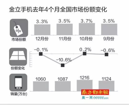 从金立手机在全国的市场份额变化上看,金立手机的市场份额和销量并未出现大幅缩水,但也没有明显的增幅。根据赛诺数据统计,去年12月,金立手机的市场份额为3.3%,份额缩小0 .1%,销量为1060万台,销量变化缩小27万台,位居全国前十名内。但相较9月、10月的市场份额有了明显的缩小。销量方面,除了10月份出现回升,其他3个月份都呈下降趋势。