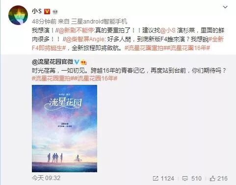 正式公布之前,大S与柴智屏在微博上还玩起了互动,在勾起16年前记忆的同时还吊足了大家胃口。柴智屏制作人亲口表示:《流星花园》真的要重拍了!