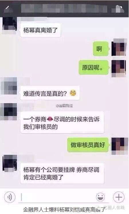 杨幂刘恺威离婚传了很久,双方声明也都发过几轮了,但还是有各种传言在坊间散播,这次,是金融界人士出手爆料。据悉,在一个金融界群里,有人声称:杨幂公司要挂牌上市,券商在做尽职调查时发现了她是离婚的状态。