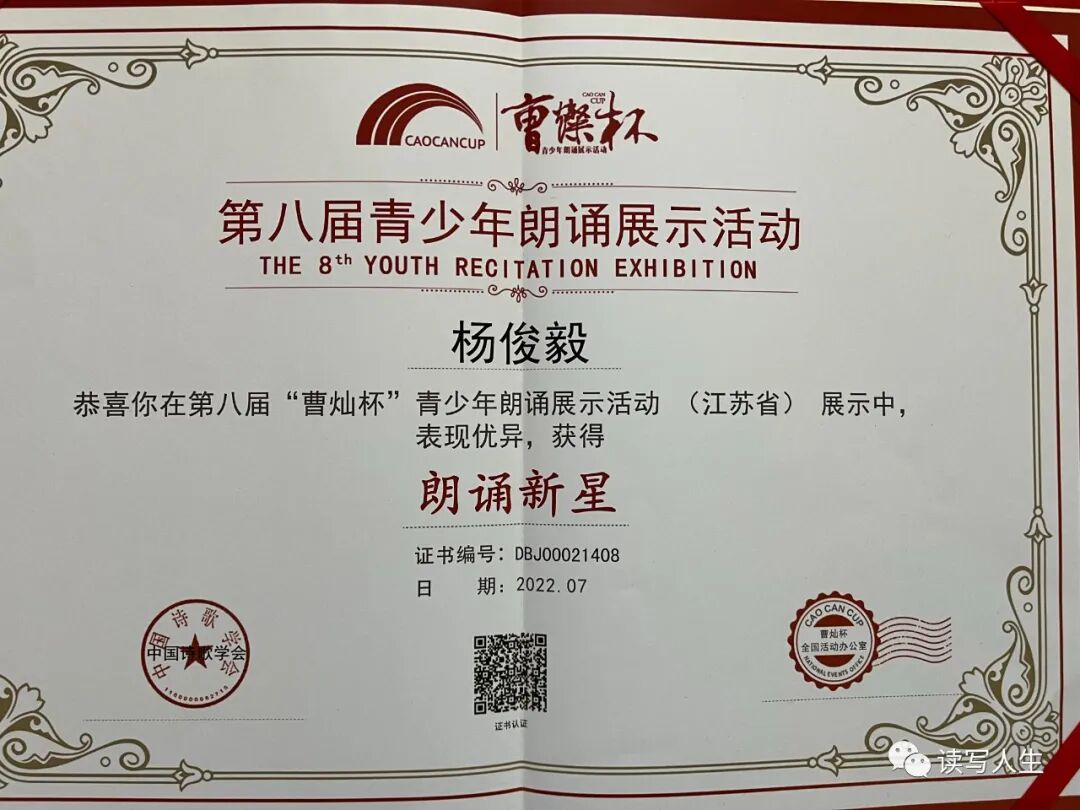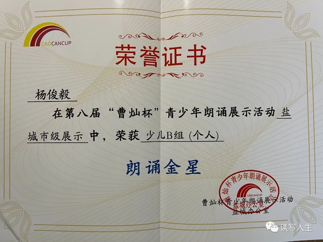 杨俊毅同学先后获得第八届“曹灿杯”青少年朗诵比赛江苏省“朗诵新星”、浙江卫视蔚蓝少年说总决赛特金奖、参演江苏“百花向阳 童心向党”六一晚会节目获一等奖,获“优秀小演员”称号、芝麻街英语配音大赛两届冠军、盐城市第五届小学课外阅读微视频大赛一等奖。