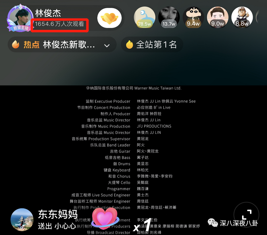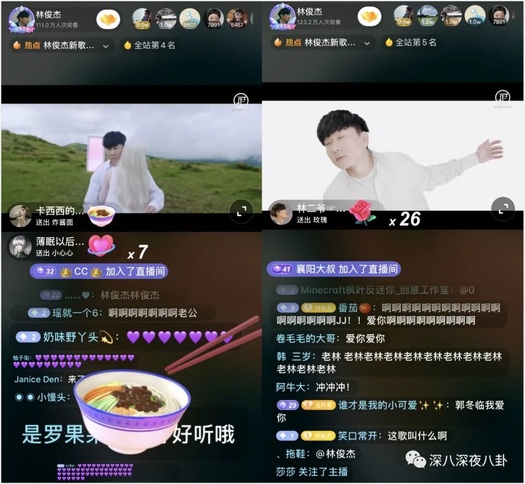 直播刚刚开始,观看人次就秒到111万,歌迷们的热情差点挤爆林俊杰的直播间,成千上万条弹幕不断弹出,送出的礼物几乎刷屏。