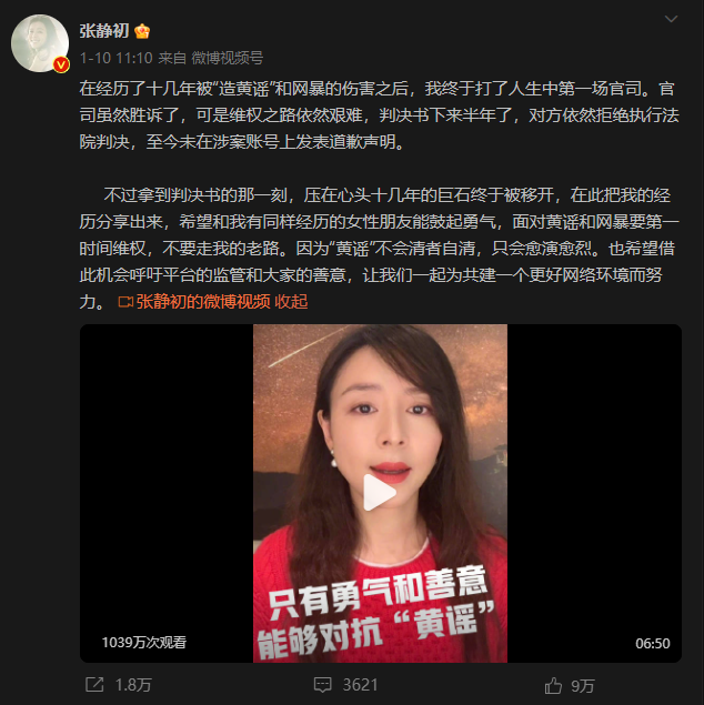 第二件,她起诉造谣者的官司获胜了。