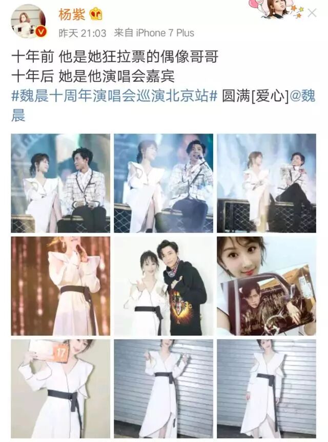 近日,杨紫作为魏晨十周年演唱会北京站的嘉宾,发微博感慨十年间的变迁。杨紫一袭白衣,美丽高贵,魏晨更加帅气成熟!