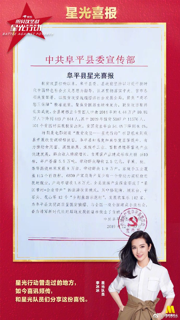 李冰冰哭了,刘昊然笑了,《星光》亮了 电影频道 内地女星 2020-01-13 07:00:57 616 创作不易,用心坚持,欢迎请BaGua喝几杯爱心咖啡!打赏并支持本文 打赏并删除本文 2020,你“脱贫”了吗?不知从何时起,自嘲“贫困人口”成为网络哈啦与日常打趣的一种潮流。来到新十年的起点,这样看似纾解压力般的调侃更在脱贫攻坚冲刺阶段集中上升。见证纪录电影《星光》逐渐成形的老编,对于此类抖机灵实在笑不出来。电影频道发起的大型公益项目“脱贫攻坚战——星光行动”,将深入调研贫困地区的中国电影人之视点呈现于大众眼前。真实记录沿途影像的《星光》,对于很多观者而言都将是刷新他们既有“贫困”与“脱贫”定义的震撼媒介。《星光》看片会现场1月10日,《星光》首场看片会在电影频道举办,而影片也将于1月18日(周六)20:15在CCTV-6电影频道首播。在首批观众的如潮好评之外,还有着同样动人的故事。比起昨日新鲜捧起的《我就是演员之巅峰对决》总冠军奖杯,近期最令李冰冰引以为傲的“奖励”是一封来自河北省阜平县的“星光喜报” ↓新春将至,艺人们的工作通告量也同步飙升。尽管无法赶到看片会现场,一直以来都对影片保持关注的李冰冰还是将《星光》影像请到了工作场地。在看到片中讲述“中国好人”罗美云一家的片段时,与成长经历产生共振的她红了眼眶。“能把‘脱贫攻坚战——星光行动’的整体以电影方式呈现、做一个大的汇总,是非常有意义的一件事。”平复后的李冰冰回忆起了16个月前的阜平调研经历,对桃子过敏的她在调研当地桃园时,毫不犹豫地吃起了刚摘的鲜桃并对浓郁的桃味儿给出评价。“那必须的,尝了好吃的话我可以推荐给更多的人,才能为我们阜平的土特产做出推广。”《星光》看片会放映期间,电影频道融媒体中心也开启了直播活动,与像李冰冰这样因工作无法亲身参与现场活动的“星光队员”们实时连线,跨越千山万水聚拢温暖《星光》。电影频道主持人全员加盟直播现场与他人不同,刘昊然这次“请假”是为了备战期末考试。没想到吧不过,潜心蹲守图书馆的昊然弟弟还是“溜”了出来,同《星光》直播间进行了语音连线,并实时创作演唱了“脱贫攻坚战——星光行动”主题曲《星光》。尽管又双叒叕遭遇歌唱滑铁卢,自己都忍不住偷笑的刘昊然却仍惦记着记录“带货”事业的《星光》大电影。2018年底,前往云南富宁调研的他曾亲自爬树采摘当地特产八角,成为“星光带货”美谈。“星光是由无数颗星星组成的,我们每一个为这次行动付出努力的人,其实都是这片星空里的一颗星星;正是因为有这么多星星,才汇成了这一片星光。”同刘昊然一样,令海南儋州的鸭鸭们“陷入恐慌”的“星光队员”蔡徐坤,也曾以“赶鸭子”的带货名场面令当地特产海鸭蛋卖到脱销。透过远程连线参与活动的坤坤,也再度为《星光》“带货”:“为了打赢脱贫攻坚战,一定要关注电影《星光》哦!”“脱贫是大家都想做的事情,贫困也是全世界都有的事情,但这其中的人们都有不同的故事与能量,”亲临看片会现场的《星光》总导演赵薇这样分享着她的创作体悟,“因此,最美丽、最动人的还是每一个人。”作为影片核心主创,带领十名青年导演用镜头记录12万公里行程的赵薇,也将每个人从孩提、少年、壮年再到老年的生长轨迹暗合于成片思路中。片中无论是深入一线的“星光队员”还是冲破苦难的普通民众,无不展现着这场实现中国人千年梦想的脱贫攻坚战役中属于人的真情。看片会现场,由扶贫领域专家、电影学者、影评人、媒体人构成的观影嘉宾阵列纷纷对于《星光》以人为本、冲破“明星公益”刻板印象的影像思维给以赞许。曾执导高分纪录片《乡村里的中国》与《出山记》的导演焦波,以特别顾问身份观照到了《星光》电影制作全程。《乡村里的中国》豆瓣评分高达9.3已看过影片各种版本达五次的焦波导演,在又一次看过成片后仍难以抑制激动心情。“真”与“情”二字感悟,都融于他饱含深情的献言之中。除总导演赵薇外,电影《星光》的主创阵容堪称强大:编剧史航出任影片文学策划,《七月与安生》剪辑师、《喜欢你》导演许宏宇担纲剪辑指导,为《乘风破浪》《缝纫机乐队》《西虹市首富》《囧妈》等影片配乐的作曲家彭飞也加盟其中。中国海报界的旗舰——著名电影海报设计师黄海此番也为《星光》义务献上一套四张的主题海报。海报取意自“脱贫攻坚战——星光行动”主题曲《星光》歌词:“我们是星光/哪怕只有一点点光亮/也全部给你/把这条路打亮/千山万水来到你的身旁……”深沉幽远的四重色调下,祖国的大好河山成为星光垂怜的暖心背景,而饱满的舞台感也暗合着中国电影人的不懈助力。据总导演赵薇现场解读,在这套海报的寓意中,每个人都像一颗星星,即便扶贫能力如星光般微弱,但集合起来就会照亮祖国的每个角落。“扶贫不是一部分人的事情,应该是我们所有人的责任。”在“星光队员”黄轩的希冀中,每一个人都应参与到脱贫攻坚行动之中,以帮助更多的地方脱贫。 照亮脱贫攻坚决胜前路的“星光”,或许就在等待你的闪亮。作者、编辑:《今日影评》康康觉得好看请点在看! 创作不易,用心坚持,欢迎请BaGua喝几杯爱心咖啡!打赏并支持本文 打赏并删除本文 感谢您的支持鼓励,我会