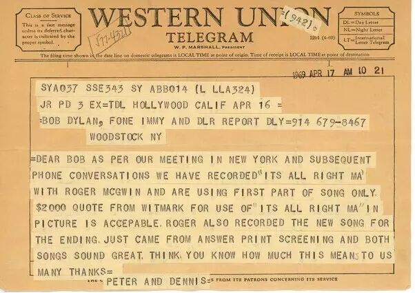 彼得·方达与丹尼斯·霍珀发给迪伦的电报,关于他们在1969年的电影《逍遥骑士》中使用《没问题,妈妈(我只是在流血)》事宜。