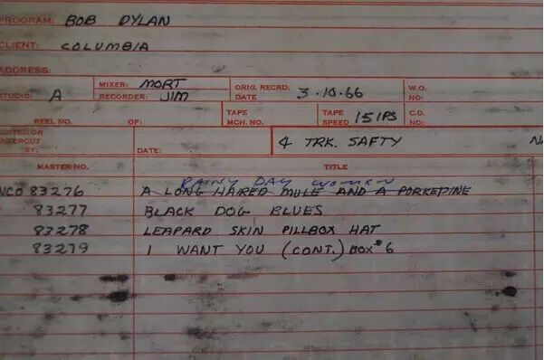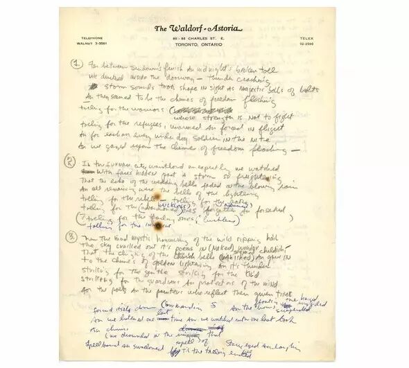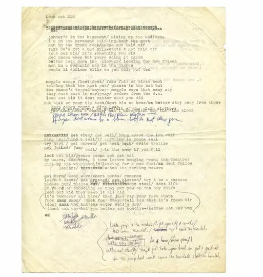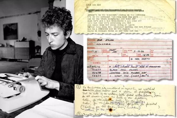 若干60年代的经典被写在沾满咖啡渍的纸片上,表明它们的作者正在努力修改那些为后来一代代歌迷所熟知的歌词(“你知道有些事正在发生但你,”一份《瘦子之歌》[Ballad of a Thin Man]的早期草稿上凌乱地写着,但没有那句“不知道那是什么”,也没有最著名的那句画龙点睛:“是不是,琼斯先生?”)它们被写在各种酒店的信纸上,表明迪伦沉迷其中,一直持续不断地进行修改。